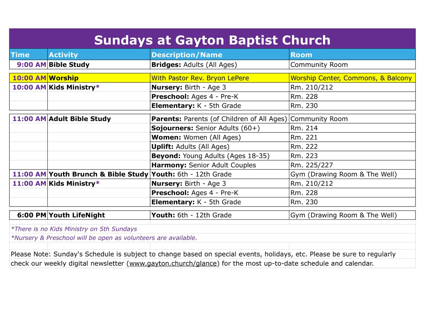 There is Kids Ministry Programming for Nursery (birth - 3yr), Preschool (4yr - Pre-K), and Elementary (K-5) during Worship at 10 AM and at 11 AM.