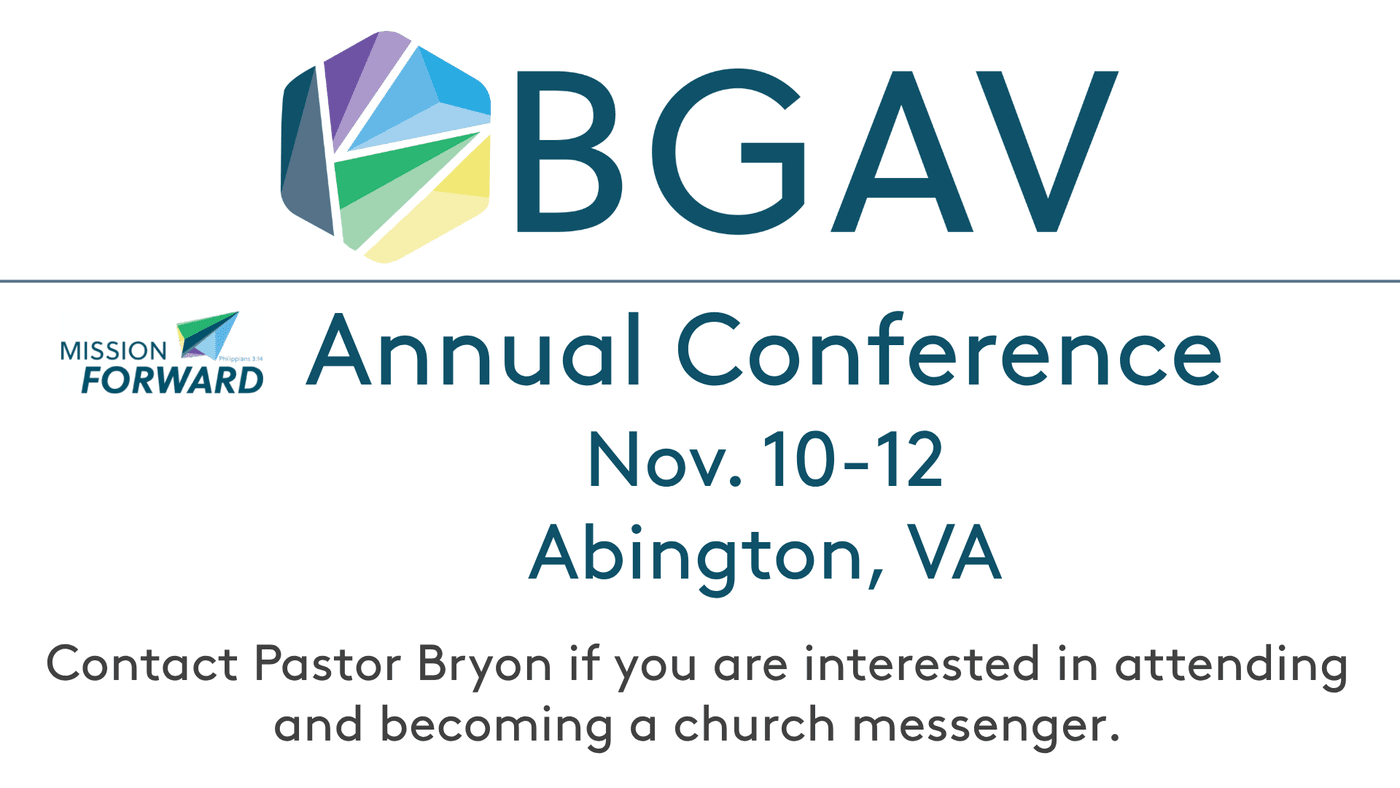 Each year, pastors, church staffers, lay leaders, and guests gather at the BGAV annual conference for fellowship, networking, and learning opportunities. This fall, the conference is from Monday, Nov. 10 to Wednesday, Nov. 12 in Abingdon, VA. This year’s theme is Mission Forward based on Philippians 3:14: “I press on toward the goal to win the prize for which God has called me heavenward in Christ Jesus.” If anyone is interested or planning to attend, please contact Pastor Bryon to be a messenger from the church.