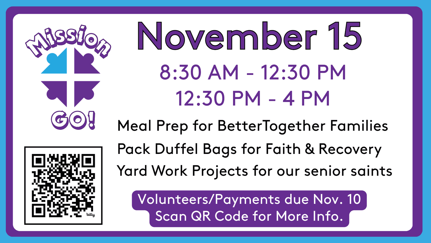 We’re excited to live out the call to love and serve our neighbors during Mission GO! on Saturday, November 15 from 8:30 AM - 12:30 PM and 12:30 PM - 4 PM. This one-day event is a chance for believers of all ages to come together and shine the light of Jesus in RVA through meaningful, hands-on projects.
