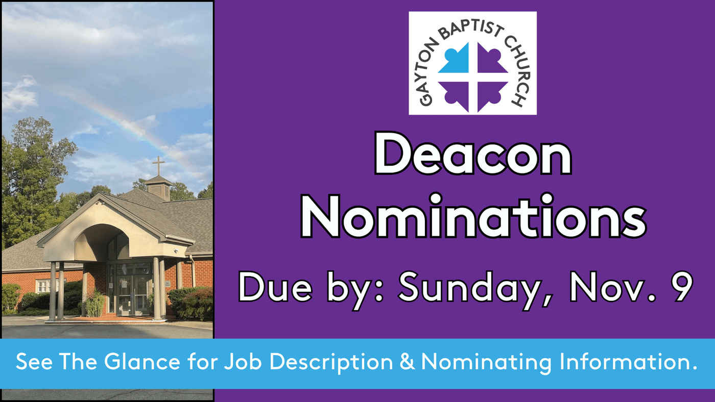 The Discernment Task Group is accepting nominations for up to three Deacon positions. Nominate online or submit a paper ballot at the Welcome Desk.