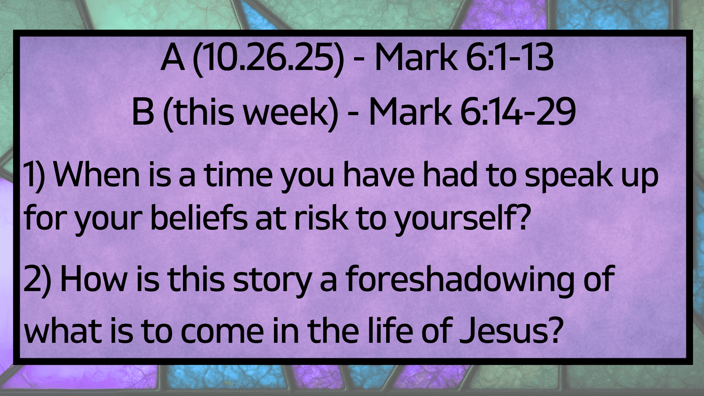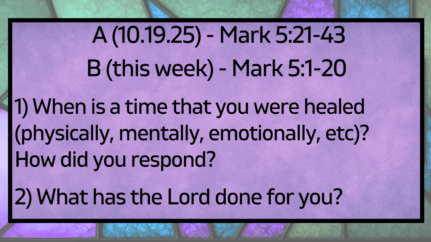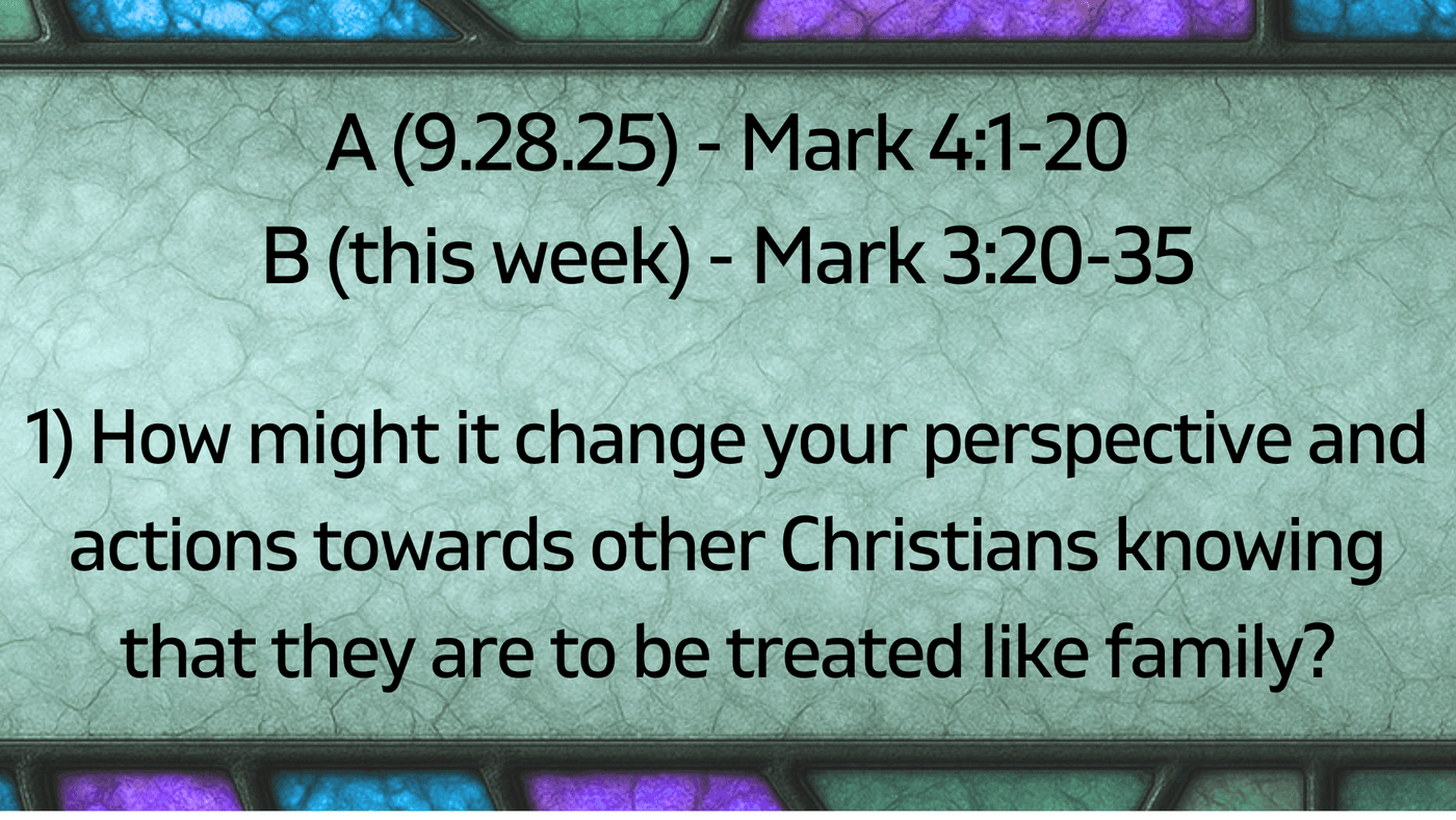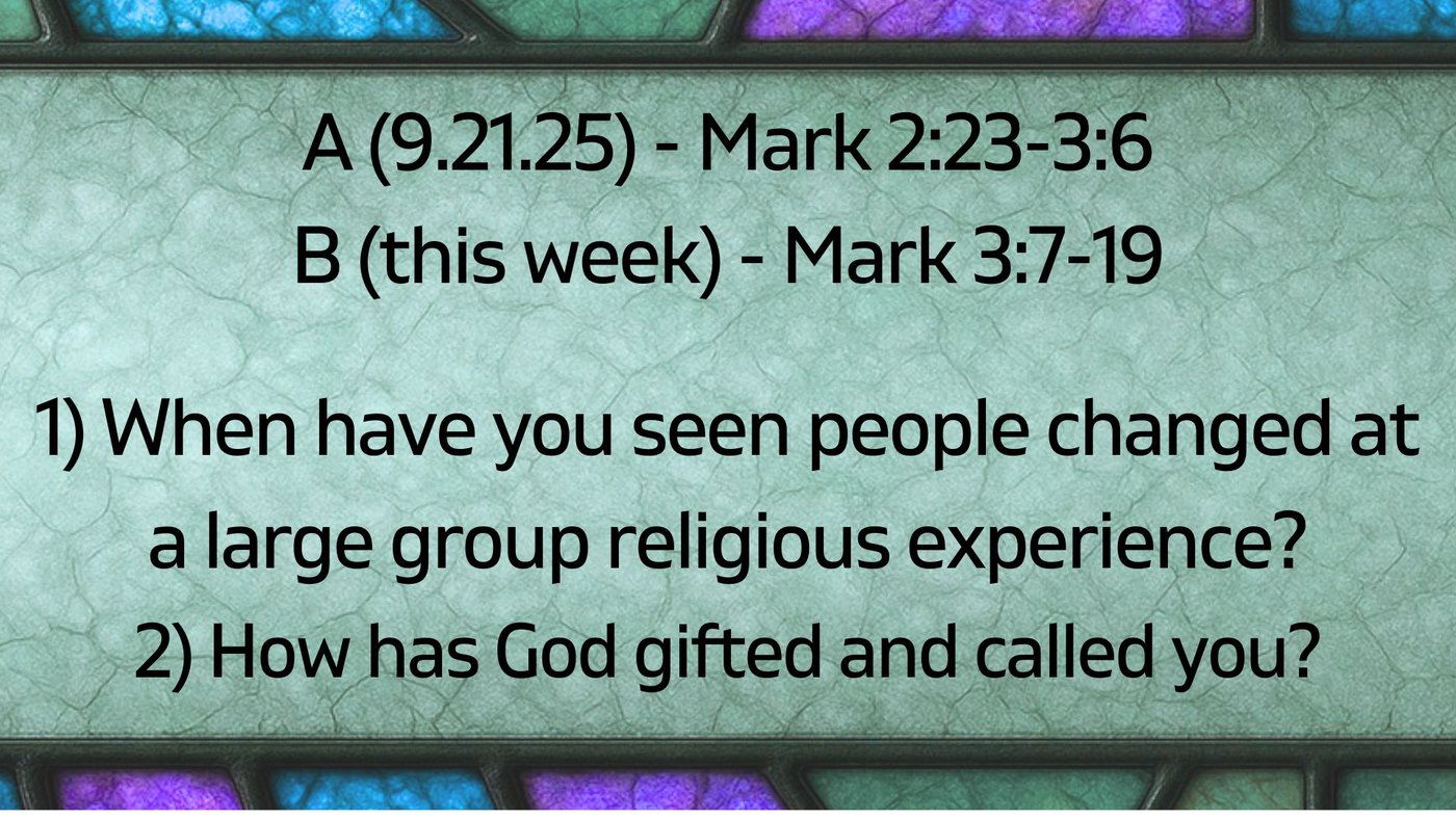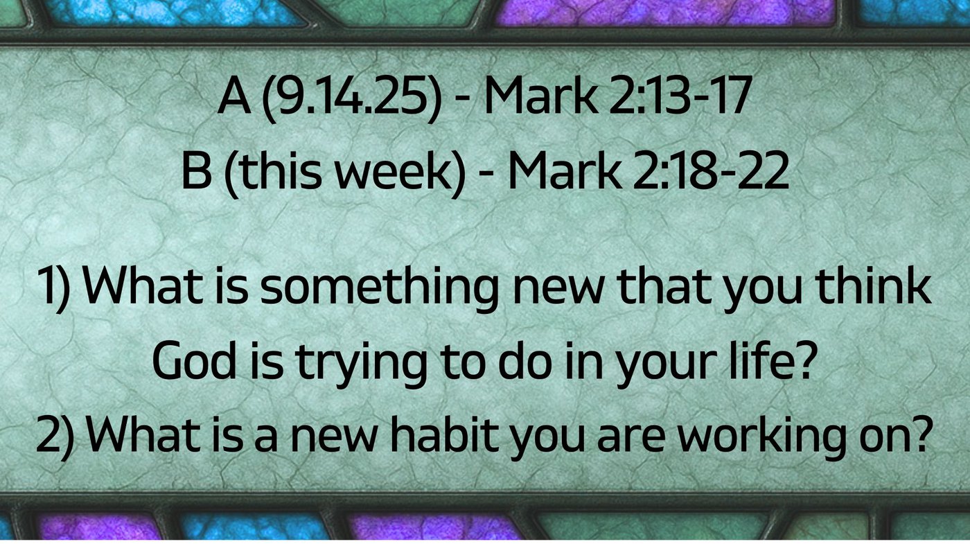 This Sunday I was excited to launch our read through of the Gospel of Mark. Each Sunday, I will preach from what I am calling the "A" text, and then will assign a "B" text for the week with the goal of each of us reading the B text with at least one other person that week and discussing it. This offers us the opportunity to study Mark together both as large and small groups. All of this is to center us as a church family on "Jesus."