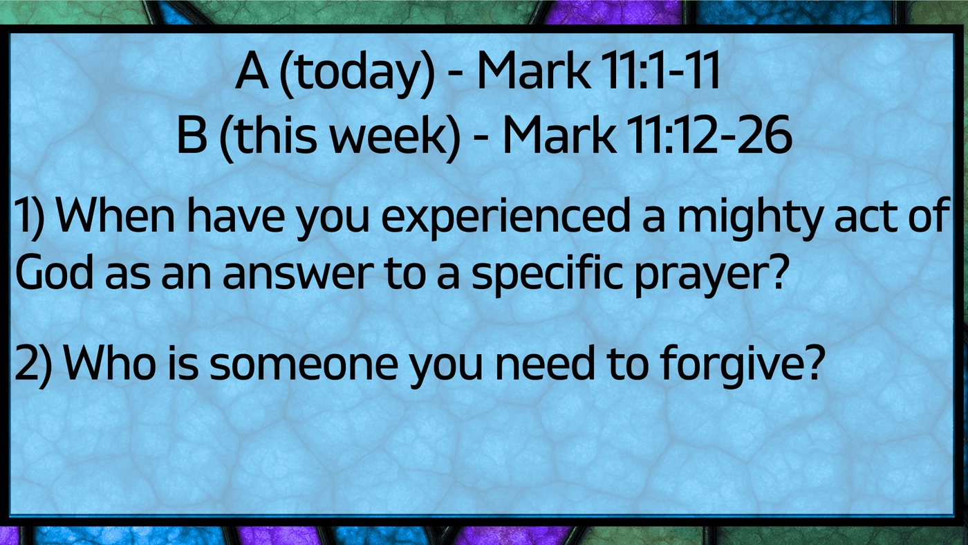 Last year we launched our read through of the Gospel of Mark. Each Sunday, I will preach from what I am calling the "A" text, and then will assign a "B" text for the week with the goal of each of us reading the B text with at least one other person that week and discussing it. This offers us the opportunity to study Mark together both as large and small groups. All of this is to center us as a church family on "Jesus."