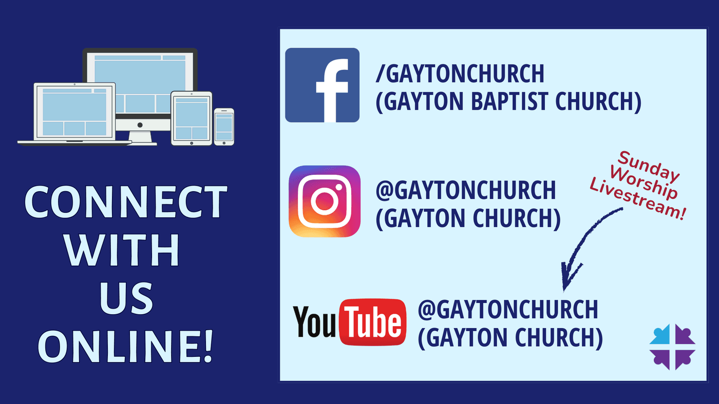 The Vine is our weekly newsletter featuring upcoming events, church news, and stories about the life of Gayton Baptist Church. It’s sent out by email every Thursday and is also shared on our Facebook page and website.