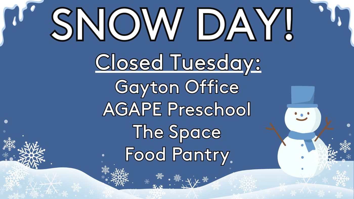 Due to the winter weather and for the safety of our community and staff, the Gayton Office, AGAPE Preschool, The Space afterschool program, and the Food Pantry will be closed tomorrow.